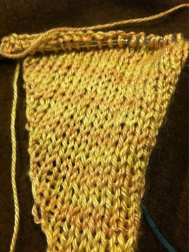 This is a sock yarn, but seems to be working pretty well with the pattern, which I’m knitting on size 8 needles. The fabric is drapey and open, and feels reeeeeeally good. I keep rubbing it on my face. Like actually stopping my knitting to rub it on my face. Really.
